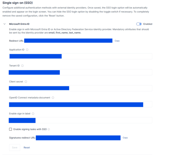 - If you'd like to enable SSO for the electronic signatures in SciNote, select the 'Enable signing tasks with SSO'.
