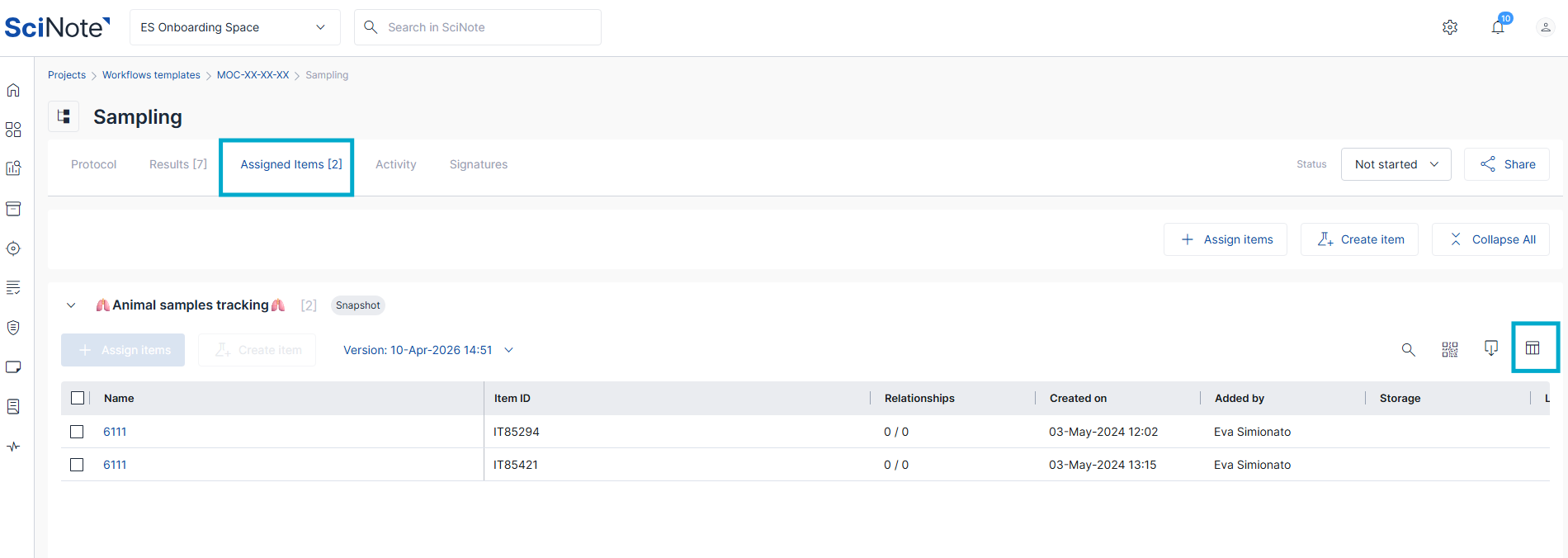 The Assigned items table within a task allows you to organize and view the specific inventory items used or produced during your experiment. To ensure you are only seeing the most relevant data, you can customize the table view by managing, pinning, or hiding columns.