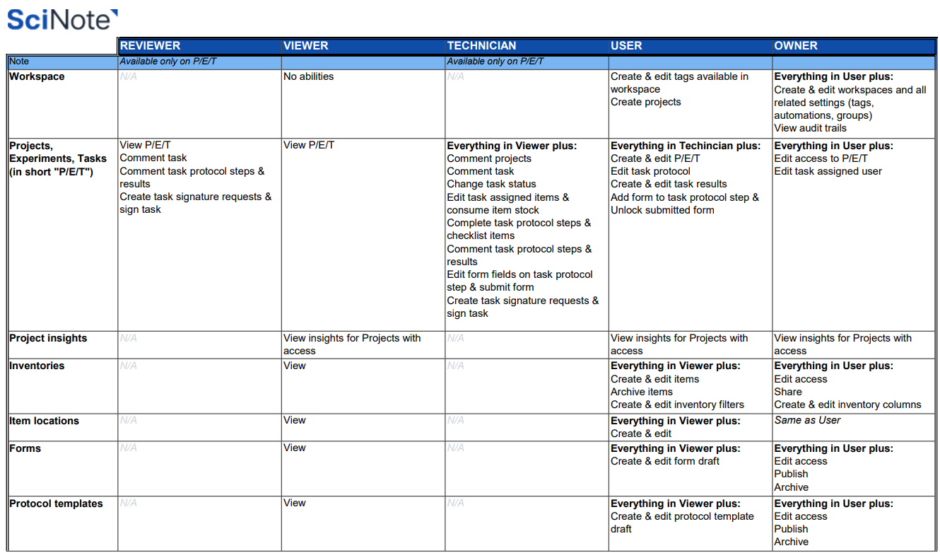 For a more detailed overview of SciNote's user roles and permissions, please find your applicable table below:
