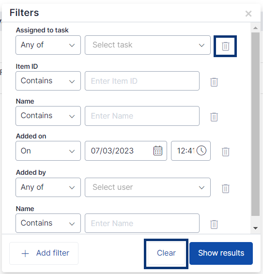 You can remove any filter using the Delete button (trash can icon) on the right or remove all filters at once using the Clear button as shown in this picture:
