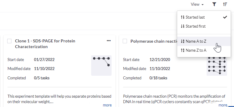 This will enable you to sort the experiments by the newest at the top if you choose From A to Z action from the drop-down menu of Sort by button.