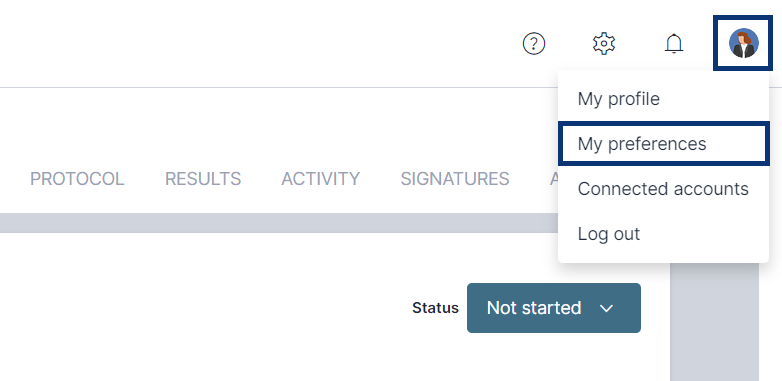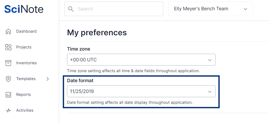 SciNote enables you to change the date format, which affects all date displays throughout the application. You can choose from different formats and select the one that best fits your needs for reporting and recording. To change it, simply navigate to Profile Icon in the top right corner, select My Preferences and choose the desired date format from the drop-down list.