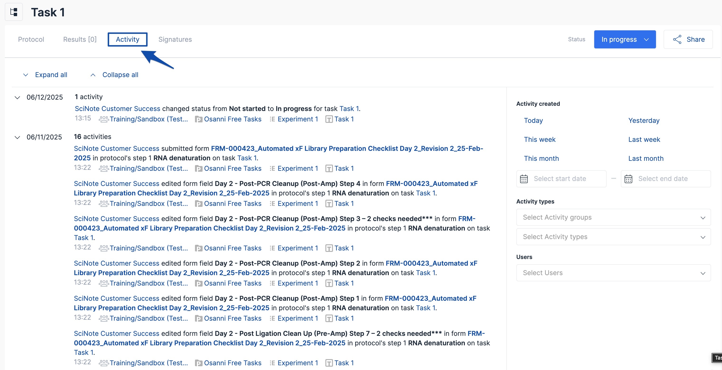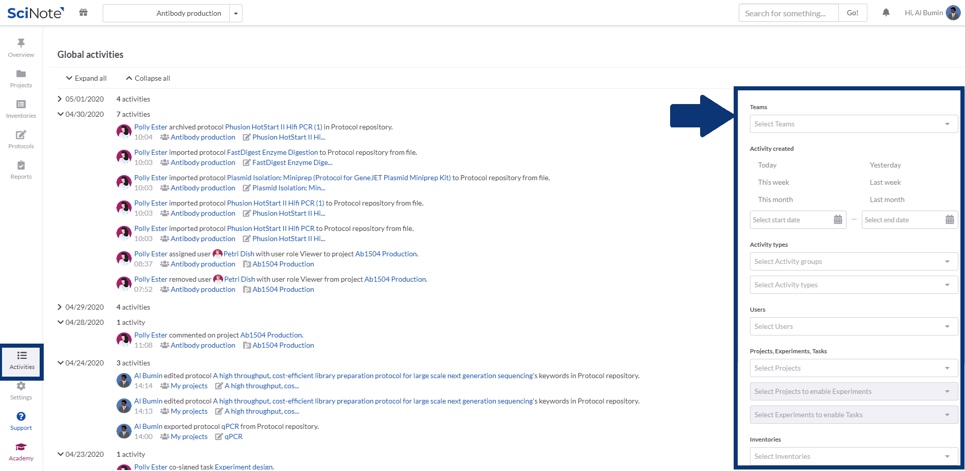 SciNote enables you to use advanced filters to search for specific activities (changes made in SciNote) you are interested in.