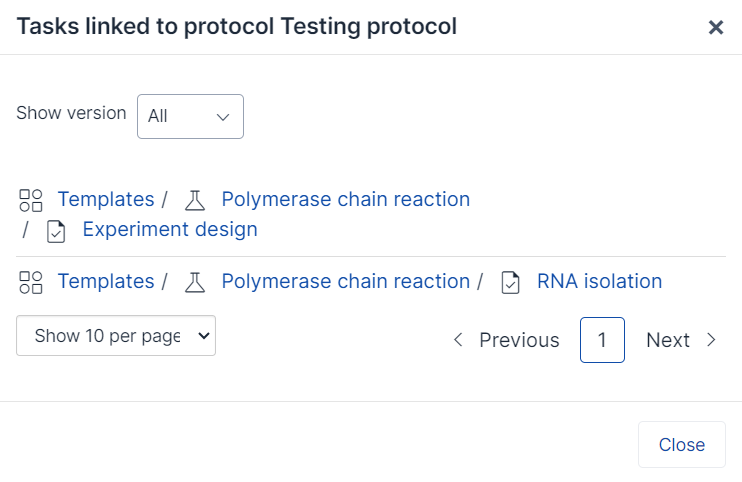 - A window opens, displaying to which projects, experiments, and tasks this protocol is linked to.