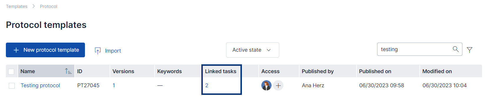 To see how many and which tasks (experiments and projects) a specific protocol from the templates is linked to, follow the next steps: