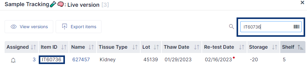 - SciNote will display the scanned ID number in the search bar and display the scanned item