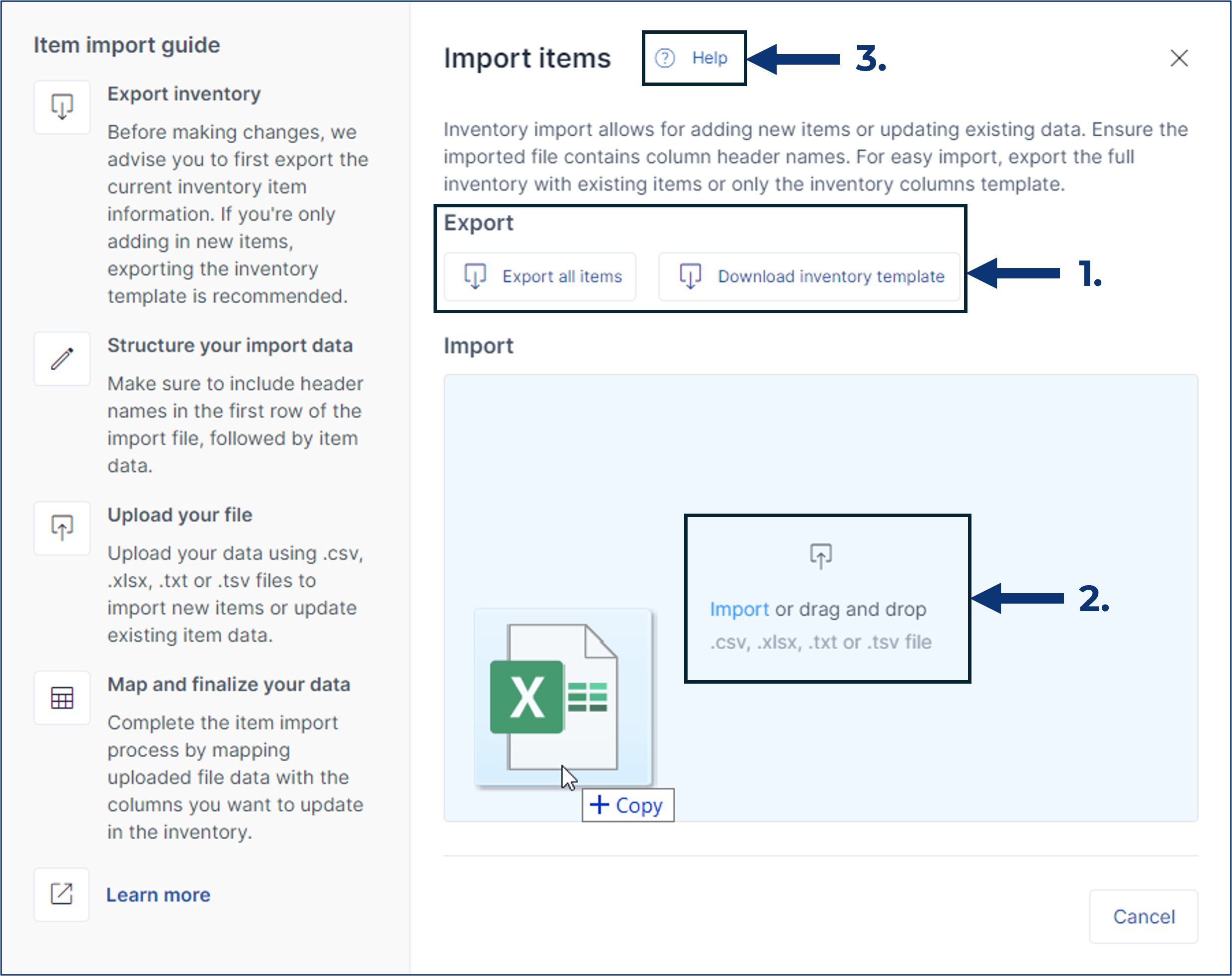- From the popup, you can also access the item import guide, download an import template file, and export a file of all current inventory item data.