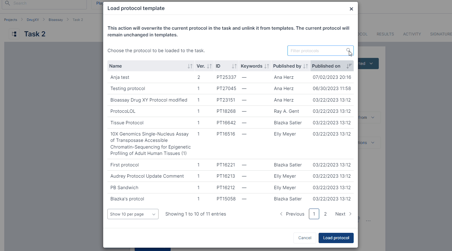 To learn how to load a protocol from the protocol template to a task watch our video tutorial.