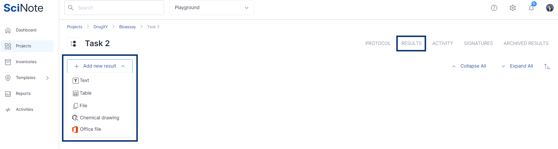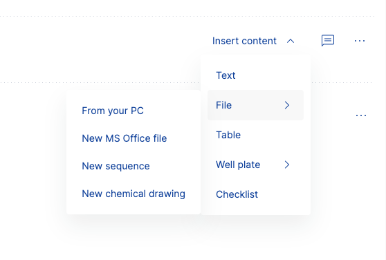 - File (upload any file type, chemical drawing or sequence, or create a new MS Office file)