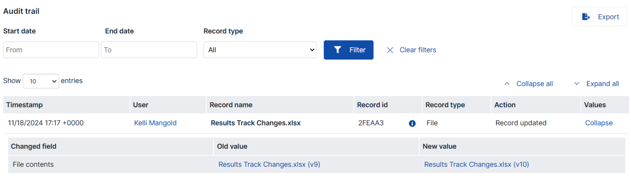 - Find the record associated with the file. Look for entries where the action is "record updated" and click "expand".