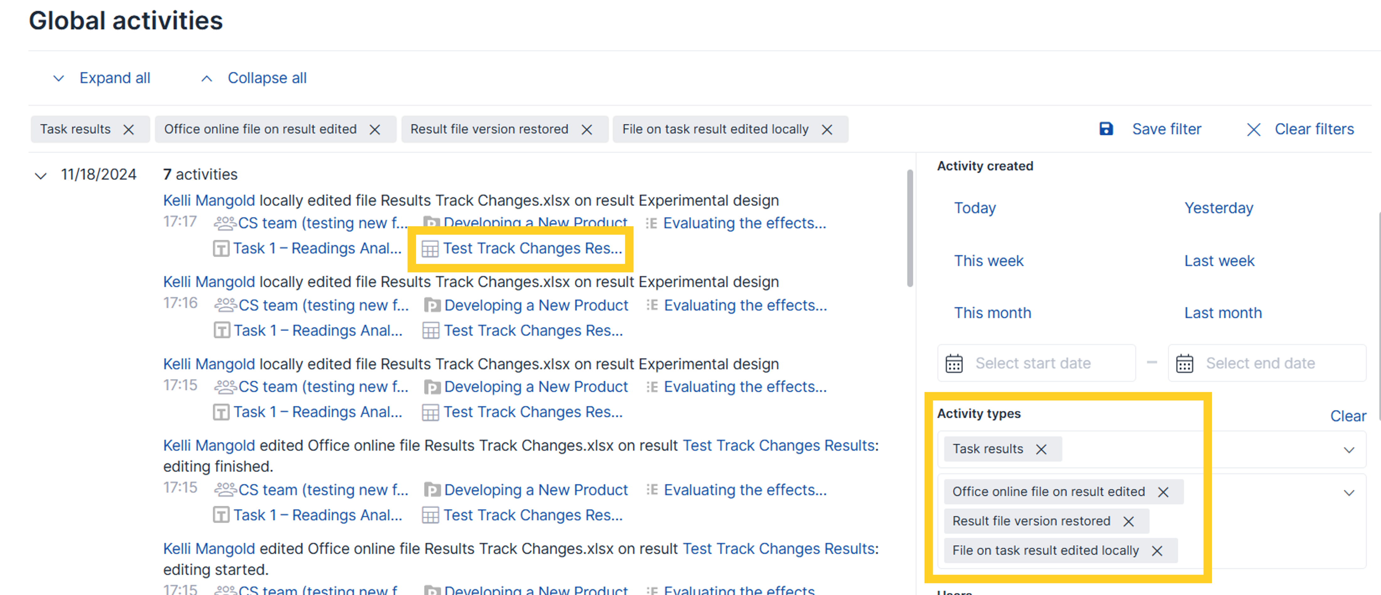 Tip: You can use the Activities trail to quickly filter for when a file was edited or restored to a previous version. From there, you can access the file directly by clicking its name.