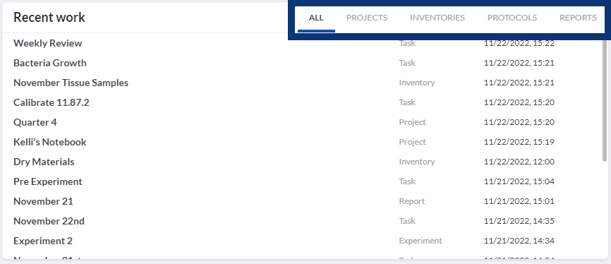 This section gives you an overview of what you have been working on recently. This includes all the work within Projects, Inventories, Protocols, and Reports. To filter down, just click on the topic type you want to view. Recent Work 1